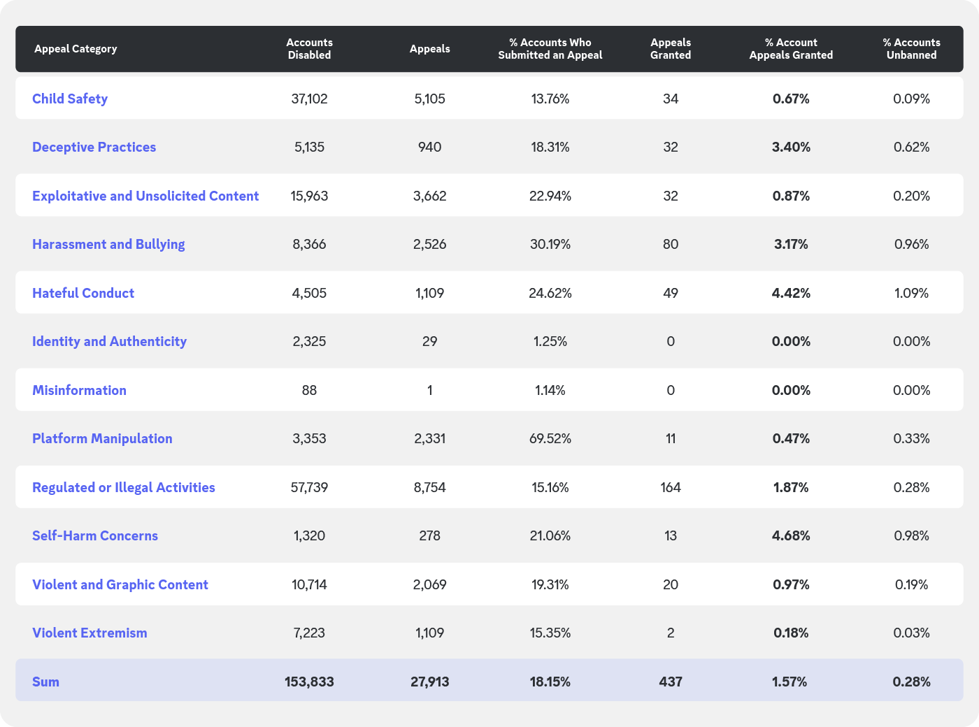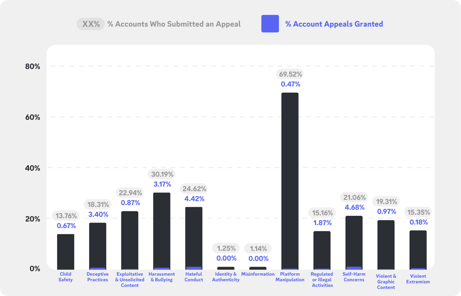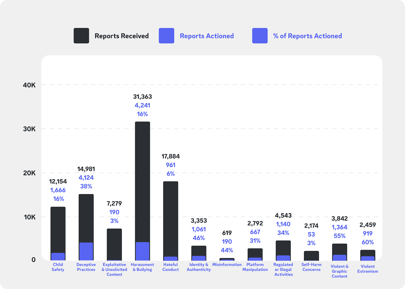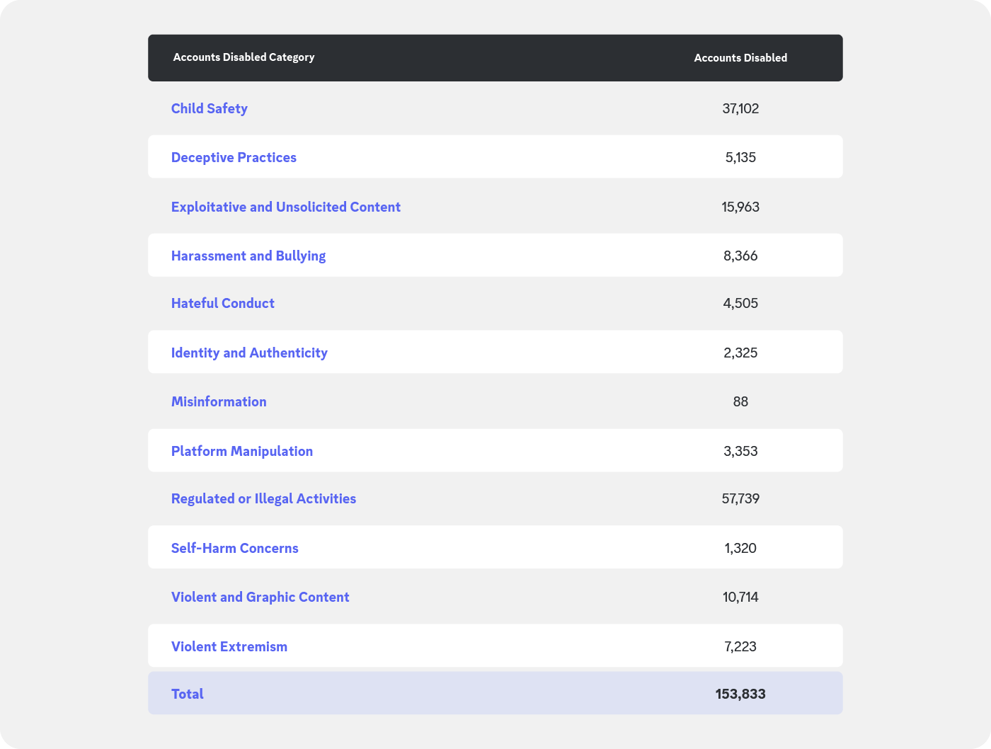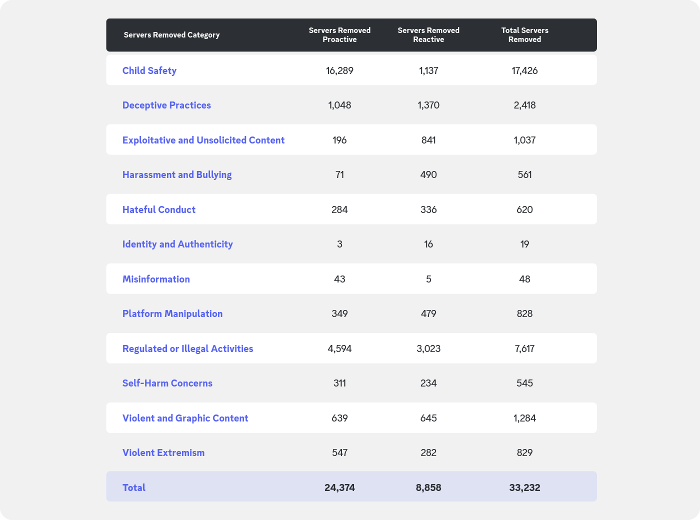 We disabled 15,963 accounts and removed 1,037 servers for exploitative and unsolicited content. This represents a 66% decrease in accounts disabled and a 43% decrease in servers removed when compared to the previous quarter.