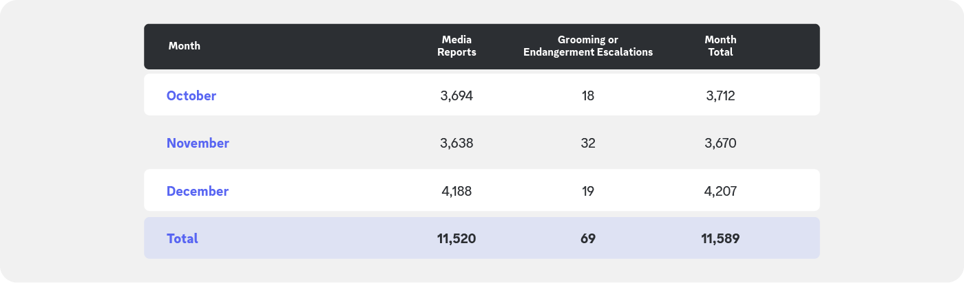 In the fourth quarter of 2022, we reported 11,589 accounts to NCMEC. 11,520 of those reports were media (images or videos), of which many were flagged through PhotoDNA – a tool that uses a shared industry hash database of known CSAM. Additionally, 69 high-harm grooming or endangerment reports were delivered to NCMEC.