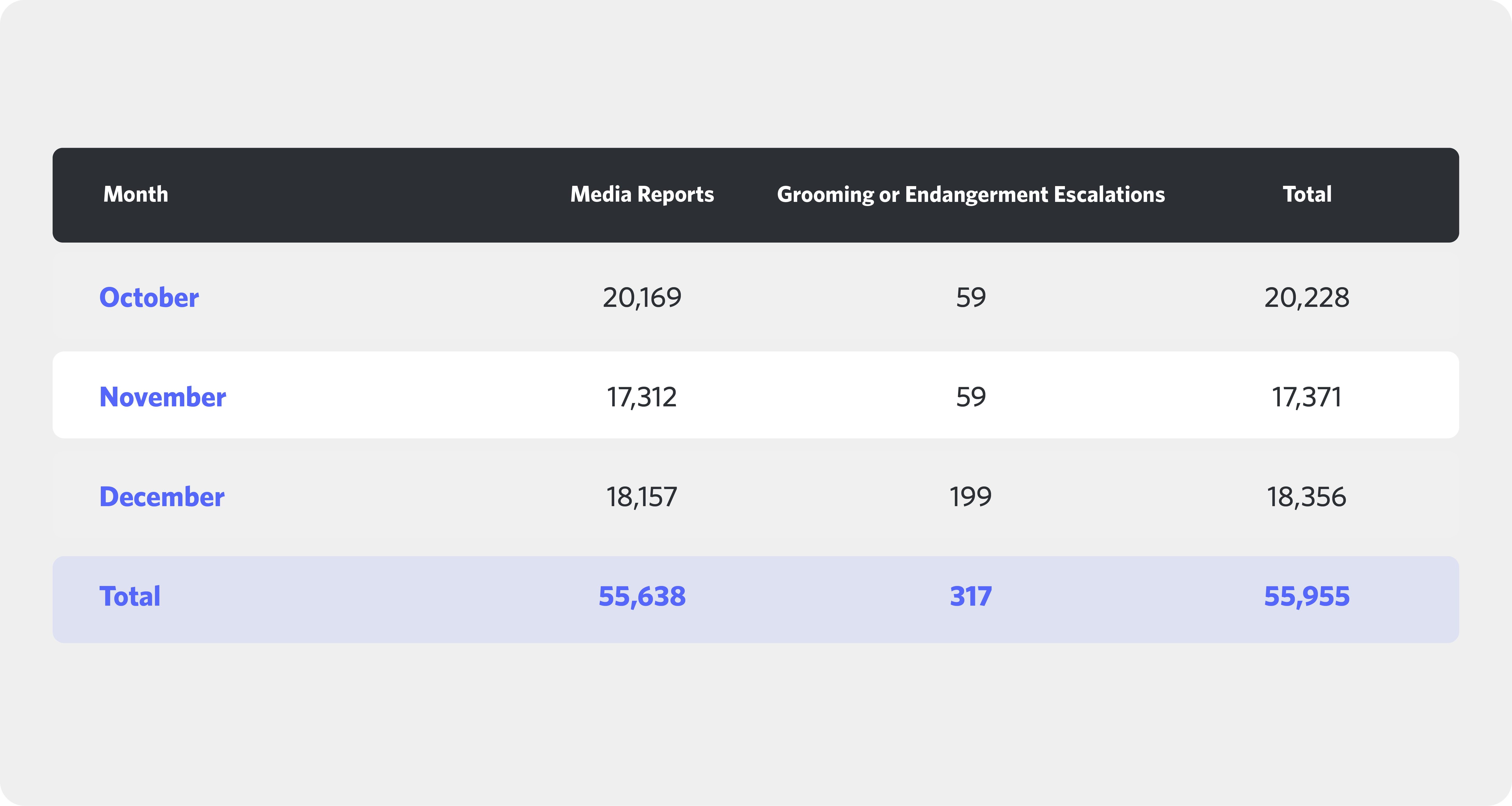 Discord disabled 116,219 accounts and removed 29,128 servers for Child Safety during the fourth quarter of 2023. We removed servers for Child Safety concerns proactively 96% of the time, and CSAM servers 97% of the time. We reported 55,955 accounts to NCMEC through our use of PhotoDNA and hashing systems such as our visual safety platform, PDQ, and CLIP, which you can read more about here.