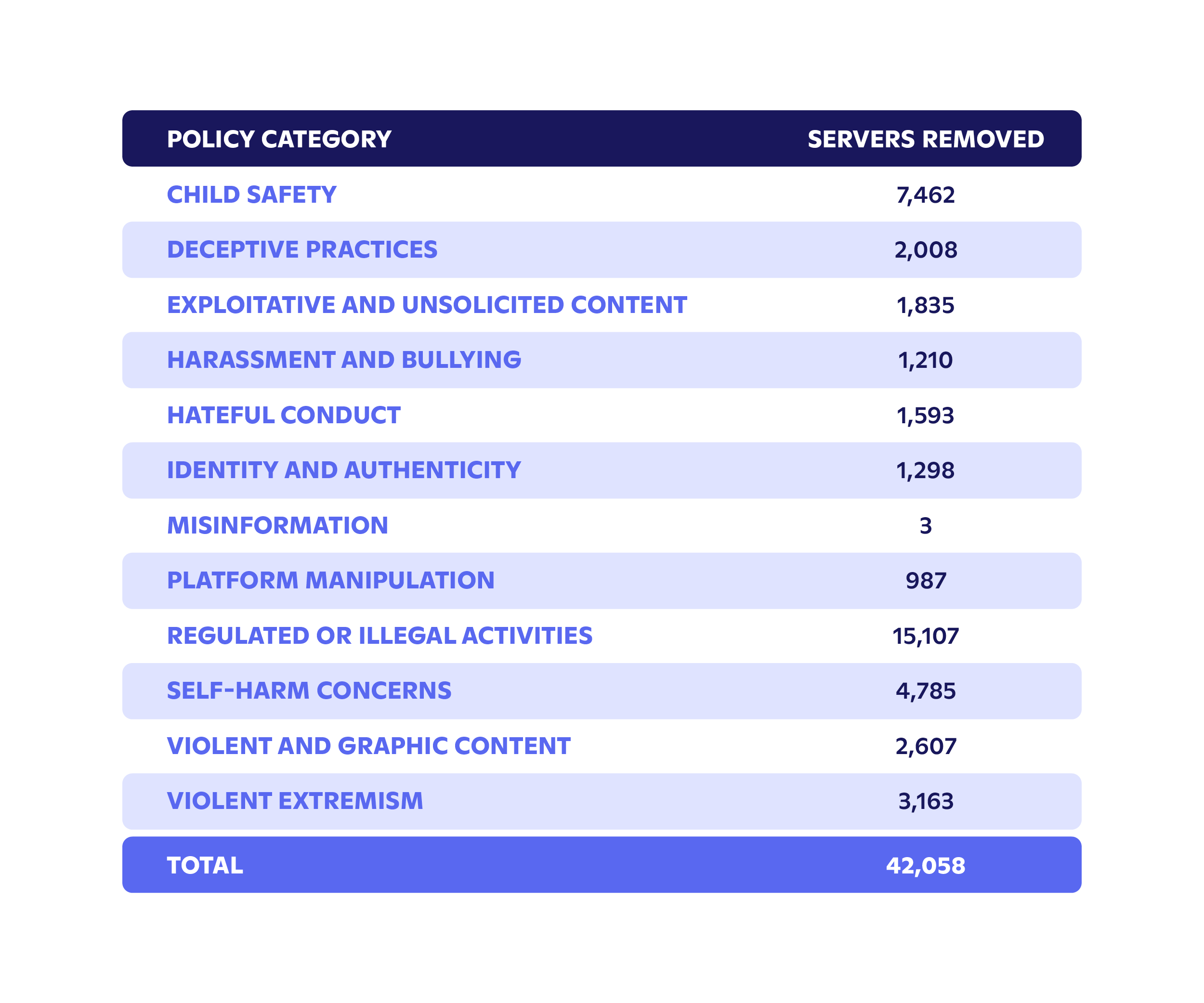 Discord took action on 33,482 distinct accounts for Deceptive Practices during this period, including disabling 24,322 accounts and removing 1,207 servers.