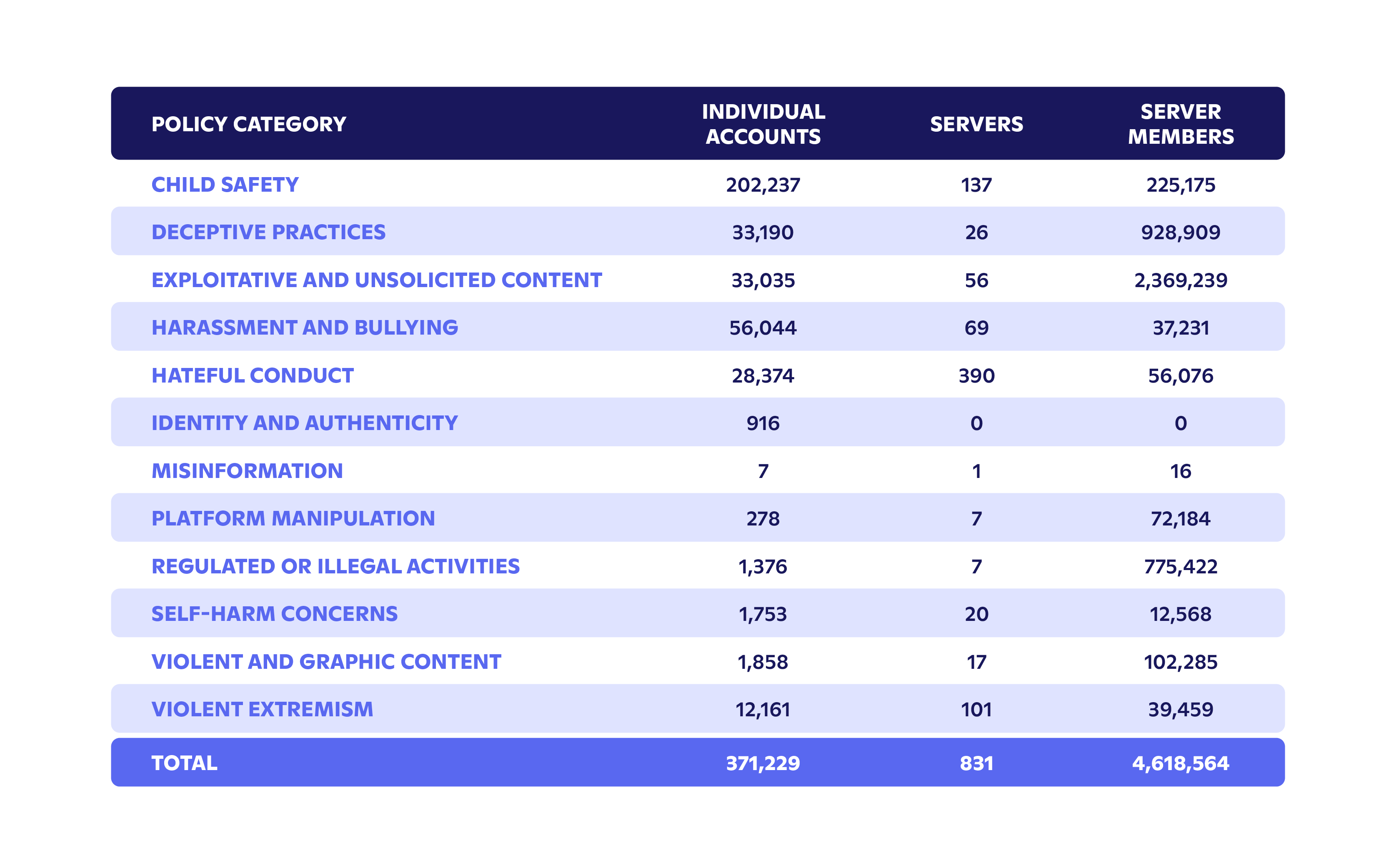 Discord took action on 346,482 distinct accounts for Child Safety during this period. This included disabling 178,165 accounts and removing 7,462 servers. We reported 101,585 accounts to NCMEC as a result of CSAM that was identified by our hashing systems, reactive reporting, and additional proactive investigations.