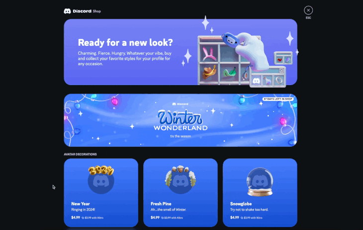 Starting this week, everyone will be able to make purchases from the Shop on the desktop or web apps and start their collection of Avatar Decorations and Profile Effects, with support for purchasing items on mobile coming in the works.