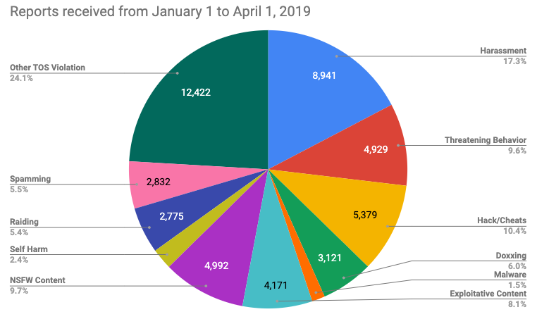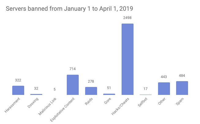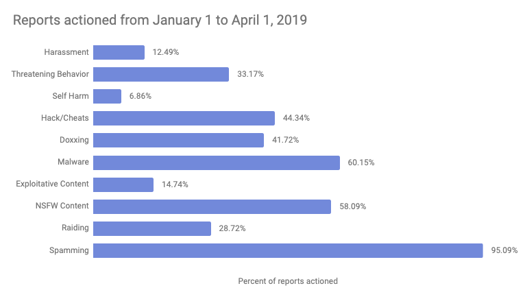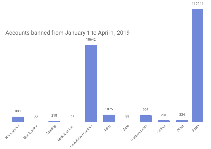 In the first three months of 2019, Discord banned the following accounts per category in response both to user reports and proactive work on Terms of Service violations: