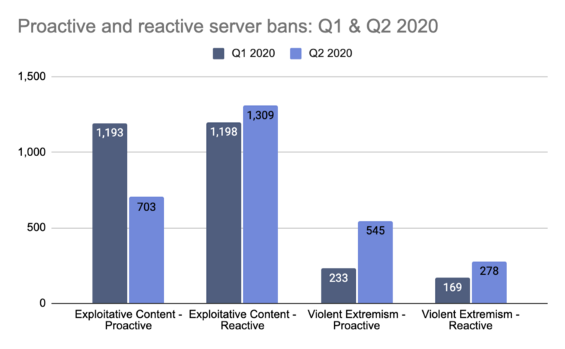 In the graph below, we’ve totaled the number of extremist and exploitative server deletions for the first six months of 2020. These volumes show a slight uptick from our proactive deletions in 2019. As we move into the second half of 2020, we will continue to monitor and deplatform extremist groups organizing on Discord as well as any users sharing exploitative content.