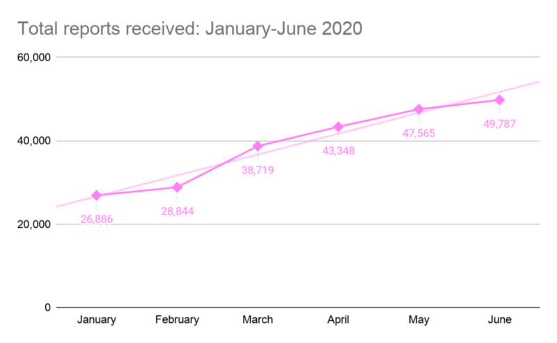 This graph shows the month-over-month increase in reports received by Trust & Safety in the first half of 2020. The reports we received almost doubled in the last few months.