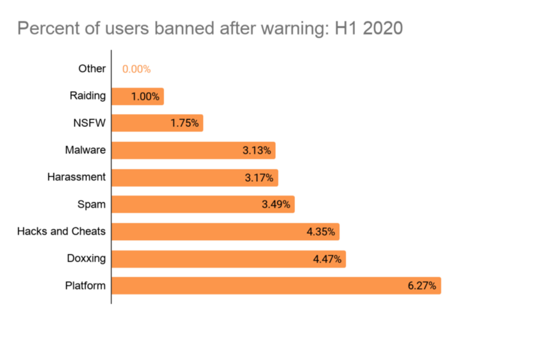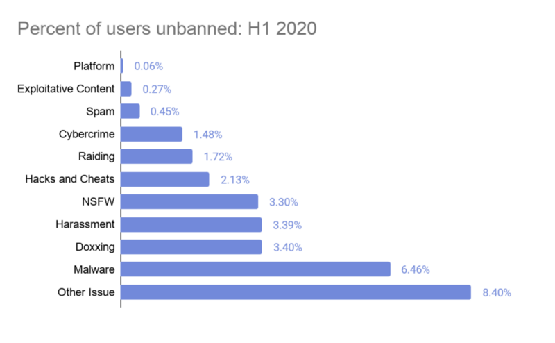 The “Other” category may stand out as being quite high, but it represents one of the smallest volume of unbans: only 289 user restorations in the entire first half of 2020.