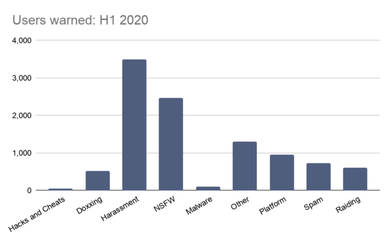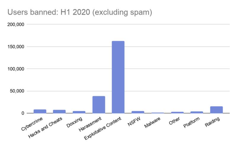 Sometimes, taking action on an individual isn’t enough: when a server’s sole purpose revolves around behavior or content that violates our Terms or Guidelines, we will take action on the entire community. Generally, this will only affect the server itself and the owner and moderators of the server, but in rare cases, it may include all participants. The chart below shows the number of servers removed in the first six months of 2020.