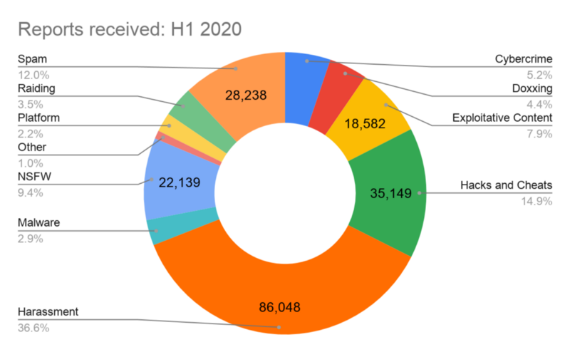 To that end, we may update our categories in future reports to better reflect what we see and what users report to us. For this report, we’ve introduced a new category: cybercrime. Cybercrime covers social engineering, fraud, scams, and things like distributed denial of service (DDoS) attacks. Our previous hacks and cheats category is now exclusive to malicious behavior in online games, such as account cracking and distribution of cheats.