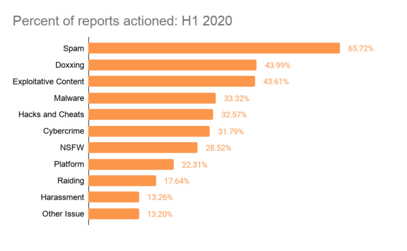 Looking back at the second half of 2019, Trust & Safety received about 128,000 user reports. In the first six months of 2020, we’ve shot way past that number, up to roughly 235,000 reports, driven by the number of people on the platform and the increased time people spent on Discord during the pandemic. Here’s the breakdown of violations by category: