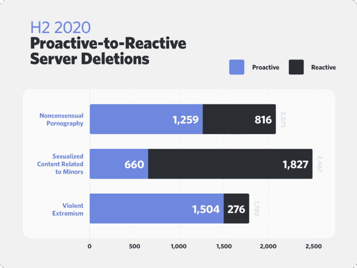 We continued to invest in resources in the second half of 2020 to proactively detect and remove the highest-harm groups from our platform. Most of Trust & Safety’s proactive efforts went towards removing spaces sharing Exploitative Content and Violent Extremist groups.