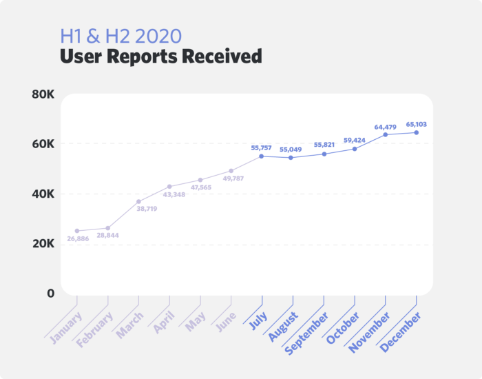 Trust & Safety received a total of 355,633 user reports in the six months between July and December 2020. This represents an increase of slightly over 50% from the first half of the year. The team was receiving slightly under thirty thousand reports each month in the months before the COVID-19 pandemic. Monthly totals at the end of 2020 ballooned to well over sixty thousand — nearly forty thousand more per month than at the start of the year.