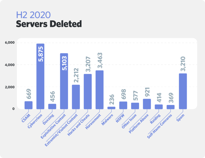 Trust & Safety removed 27,410 servers between July and December 2020 for violations of our rules. Deletions for Cybercrime and Exploitative Content were most frequent in this period.