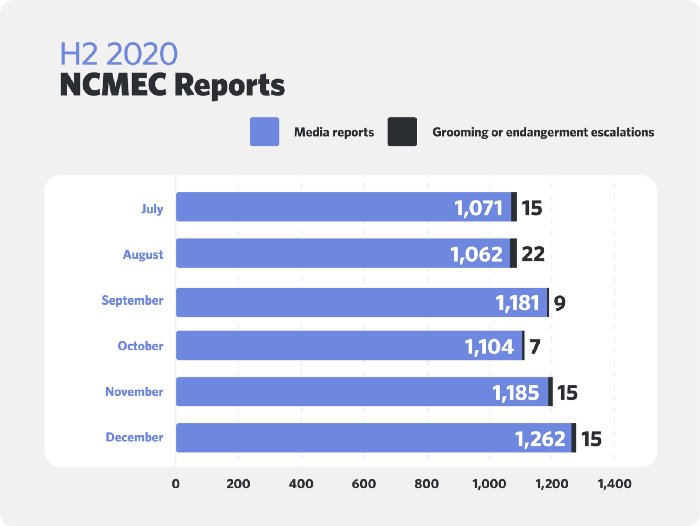 2020 was a year of rapid growth for Discord. We felt honored to welcome many new people to our platform during the COVID-19 pandemic. Discord Trust & Safety worked hard in this time to keep pace with the growing user base. The team was able to respond meaningfully to an increased number of reports while maintaining proactive efforts to keep the highest-harm actors off the platform. We also sought to advance online safety in new ways by forming closer industry partnerships and by investing in community resources like the Discord Moderator Academy.