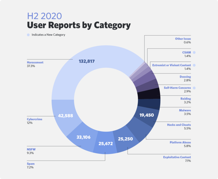 The pie chart above represents the number of inbound user reports Trust & Safety received in the second half of 2020. The totals in this chart do not represent confirmed instances of violations of Discord’s Community Guidelines but rather the number of reports of content.