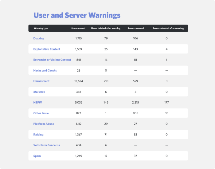 We continued to lean into using warnings as a way to course-correct users and servers responsible for less severe violations of our Community Guidelines. The decision to employ a warning over permanent deletion is generally only made if little harm results from the behavior and if the context suggests a violating party has the potential to reform. While some users and servers continue to violate Discord’s rules after receiving a warning — and are later deleted — the majority are able to continue on our platform without the need for further intervention.