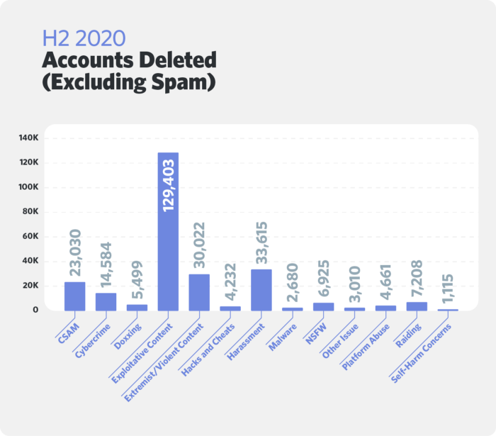Trust & Safety issued 28,170 user warnings in the second half of 2020 as well as 3,999 server-level warnings. We do not issue warnings for CSAM or Cybercrime at either the user or server level — and we also do not warn servers for Hacks and Cheats or Self-Harm Concerns. Violations in these categories are generally severe enough to warrant immediate deletion.
