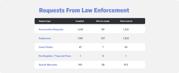This Transparency Report iterates on the work we have done previously and expands the scope of the information we’re making public. We are for the first time detailing the number of servers warned for violations of our platform rules, the number of child-safety issues flagged to the National Center for Missing and Exploited Children (NCMEC), as well as the number of requests we received from law enforcement, and the rate at which we complied with legal process.