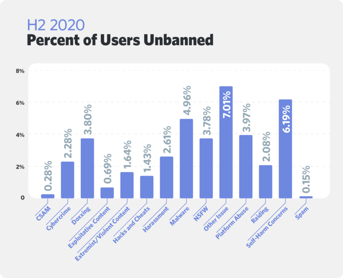 We received 82,166 non-Spam user appeals in the second half of 2020 — up from about 70,000 in the first half of the year. These users were each looking to reverse one of the 266,075 deletions issued by Trust & Safety. We reversed our decision in 3,937 cases — translating to an unban rate of about 1.5%. We granted an additional 3,061 appeals for users deleted for Spam.