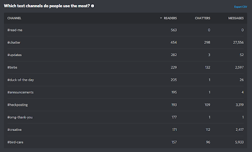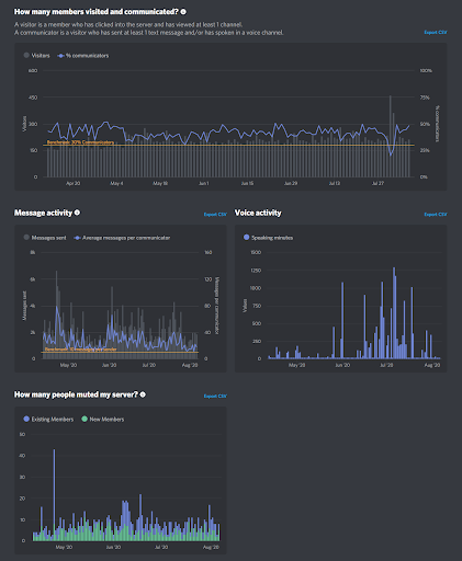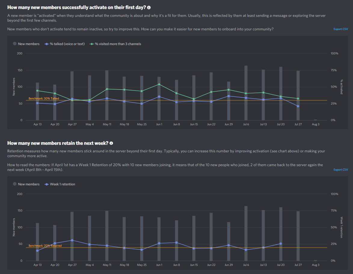 Discord provides all community servers with 500 or more members with an insights panel, which has tons of valuable stats. The activation, retention, and engagement charts it provides are awesome indicators of how things are going. Note that they are based on percentages, not just raw amounts.