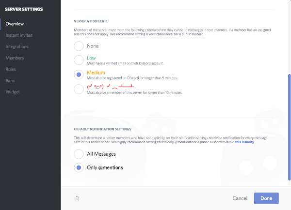 For a public server, we recommend at least setting your Verification Level to Low. We highly recommend setting the Default Notification Settings to Only @mentions though.