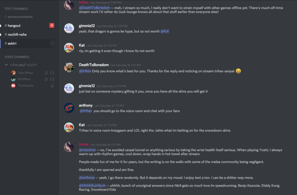 Speedrunner and Mario Maker Extraordinaire, Trihex, has a Discord text channel called #asktri. Most of the time, this channel is locked and people are not allowed to send messages (similar to how we have the welcome channel set up earlier in this article). At times, he’ll open up the channel for people to ask him questions for a short period of time. He then hangs out and answers questions before locking it again, creating an ever-evolving and archived AMA for his fans and followers.