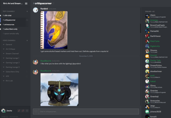 If you’re an artist/streamer, consider having a channel inside your server dedicated to feedback on your viewers’ art. They can request feedback from other members and yourself. This is a dope way to keep people stuck and engaged. Chibi-conjuror, Rin the Yordle, has a Discord server focused around her art stream. In the #critiquecorner channel, people post their works-in-progress and get live feedback from other members and Rin herself.