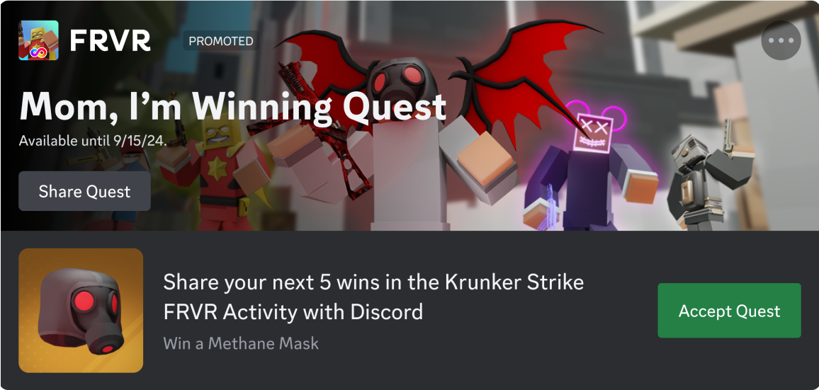 FRVR partnered with Discord to implement an "in-game" Quest through direct API integration with Krunker Strike. Players were required to complete a specific in-game objective: win 5 multiplayer battles.
