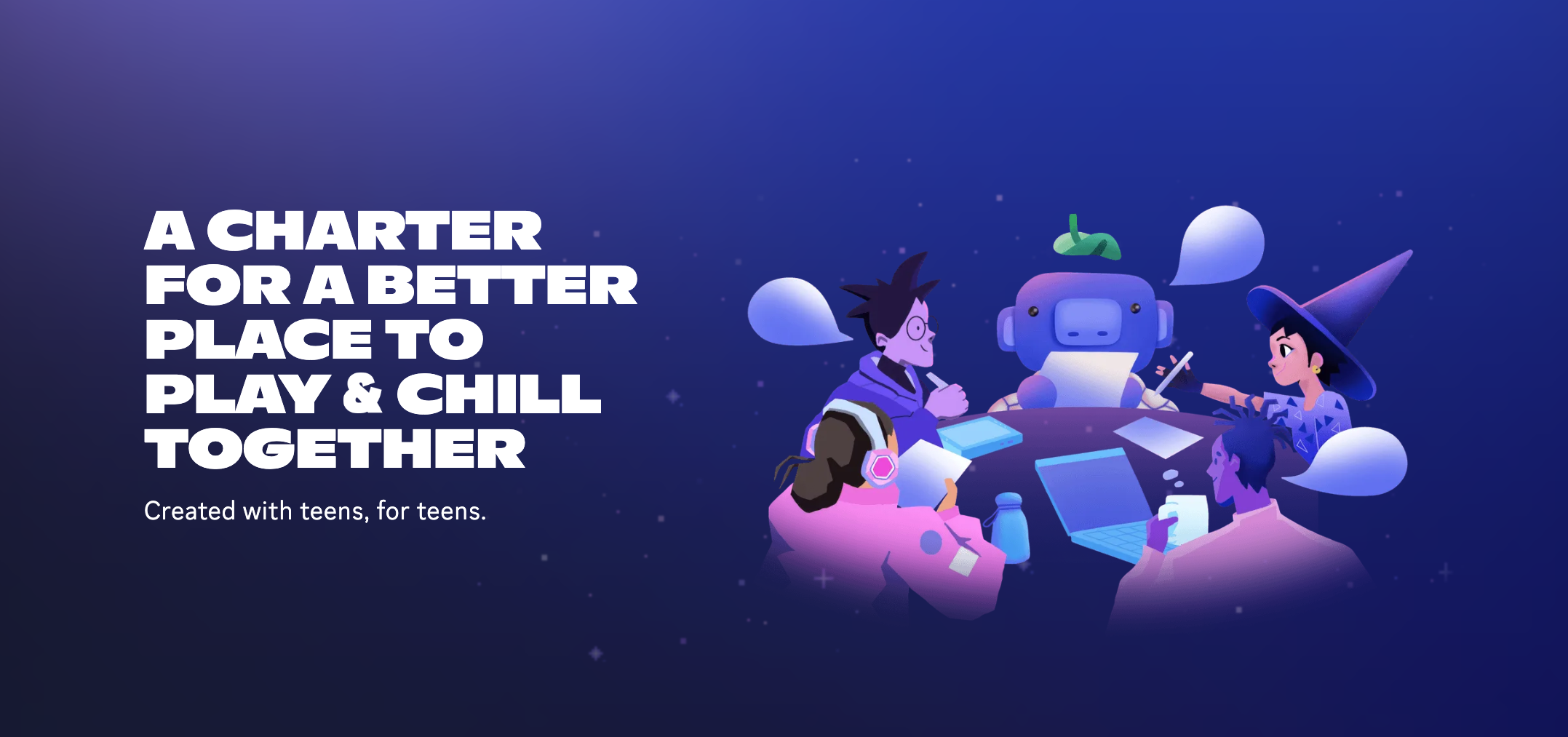 While our Community Guidelines explain what is and what isn’t allowed on Discord, we hope the Teen Charter principles will ultimately guide users to take on a shared responsibility in creating a fun and comfortable space to play and chill with their friends. These principles will also help inform product and policy improvements on Discord, serving as a guiding beacon for us to help teen users thrive.