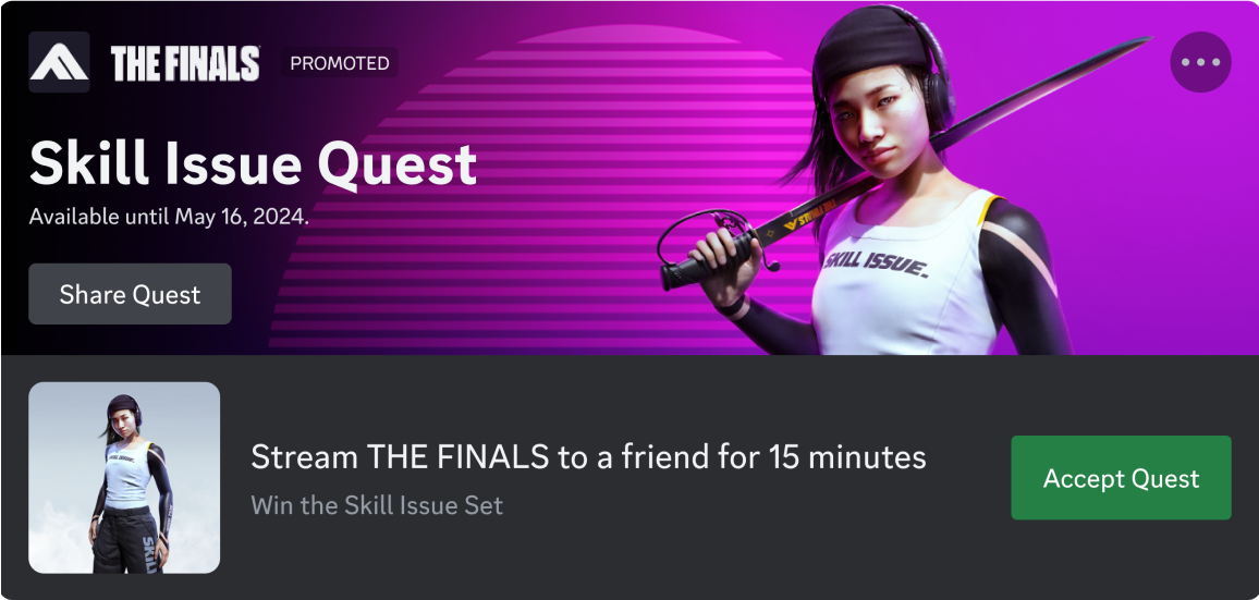 THE FINALS partnered with Discord to launch the Skill Issue Quest which tasked players to stream 15 min of THE FINALS to a friend. By completing the Quest, players would earn an exclusive in-game reward called the "Skill Issue Set," which would quickly become a highly coveted item by the community.
