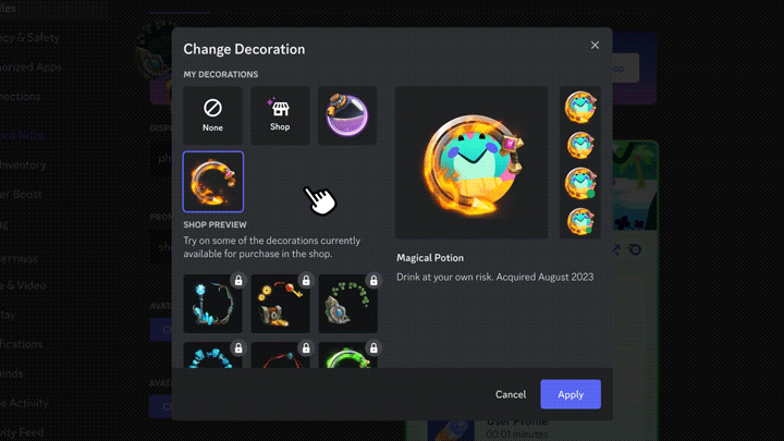 You can find all this in the Shop, located in User Settings > Profiles > Go to Shop on either the desktop or web apps! While you can’t purchase items from the Shop on mobile at this time, you can still apply any decoration you’ve previously purchased while on the go.